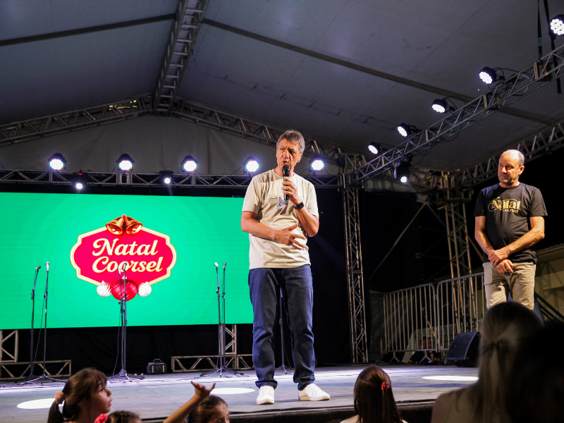 Minutos antes, o presidente da Coorsel, Arilton Francisconi Candido, o Xela, e o vice-presidente, Frederico Francisco Hoepers Preve, o Fred, subiram ao palco para oficializar o acendimento das luzes do Natal Coorsel. A iluminação acompanhada da neve cenográfica arrancou sorrisos e admiração de todos os presentes.